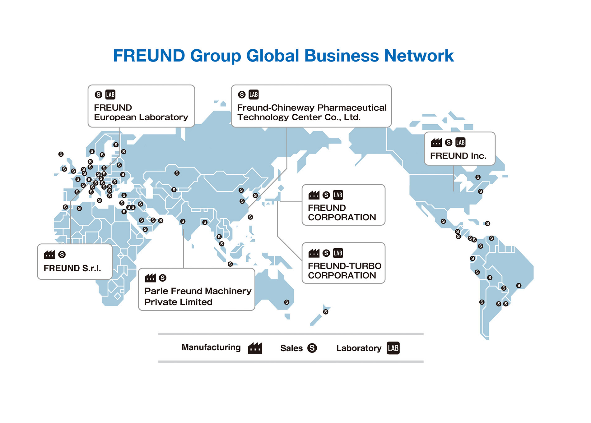 FREUND Inc.(Iowa, USA) is a machinery and equipment manufacturer founded in 1972, and started manufacturing and sales of granulation & coating devices destined for North America and Latin America in 1979 as our licensee.