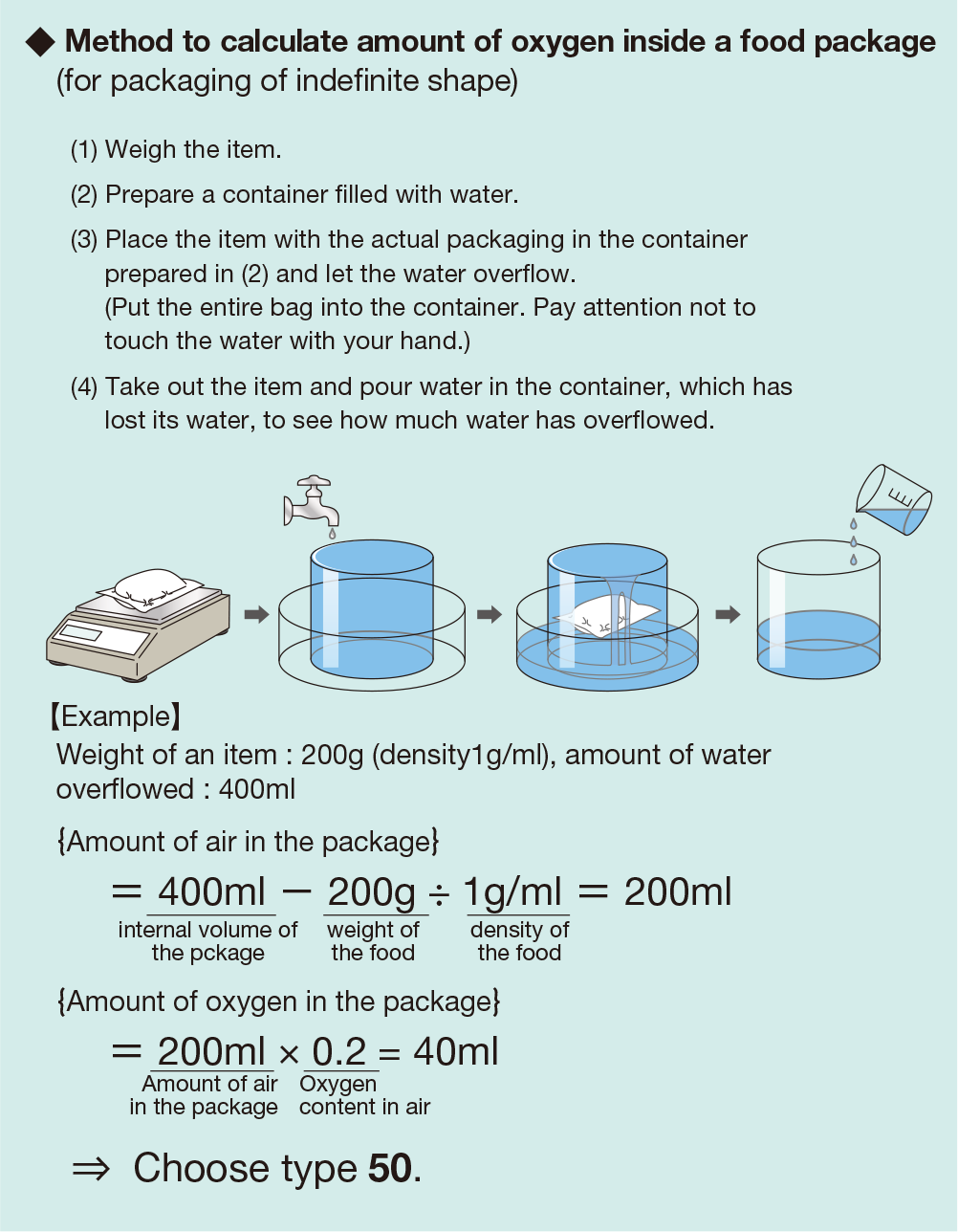 Moisture-dependent type … Deoxygenation is performed as soon as it comes into contact with the moisture generated from foods. Use this for foods with a water activity value of 0.85 or more.