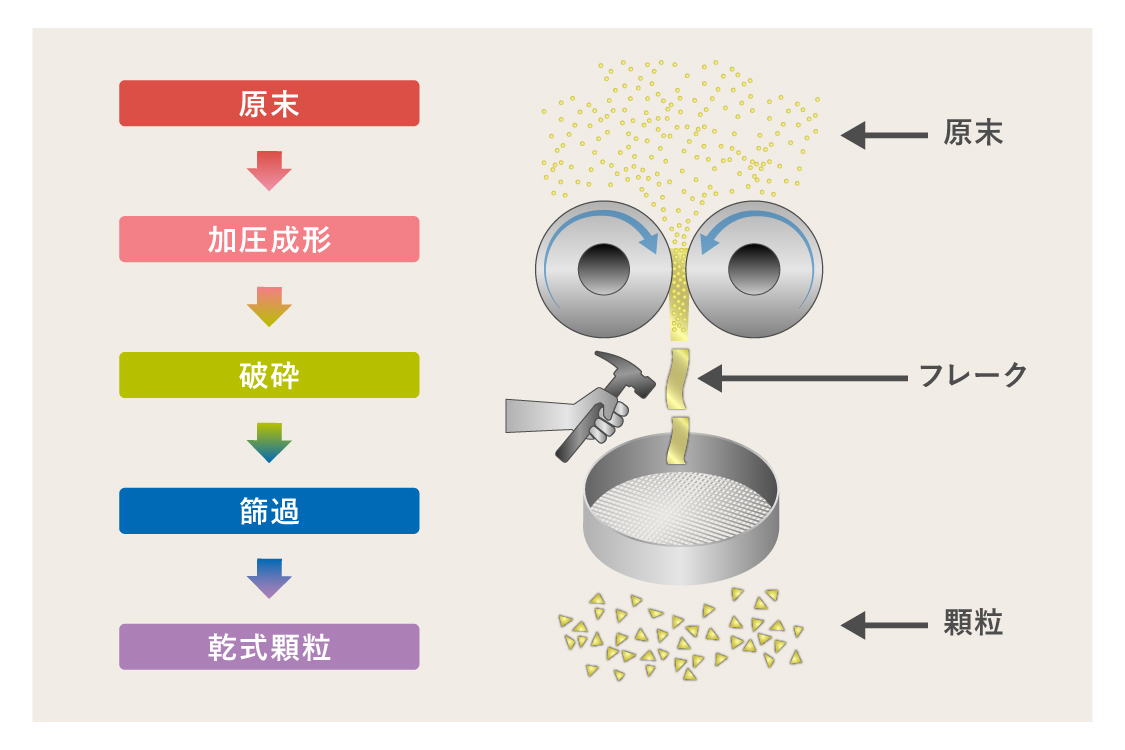 原末から圧縮顆粒が得られるまでの工程の概略を図21)に示します。粉体原料は、板状(フレークまたはリボンと呼ばれます)に成形され、破砕造粒装置(整粒装置)で整粒されます。乾式造粒装置と破砕造粒装置の概略図を図3に示します。