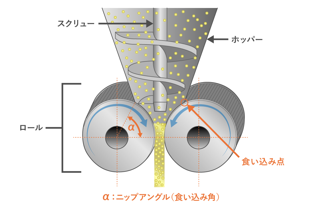 RC 造粒ではロールと粉体の摩擦により、粉体がロール間に食い込まれます(図8) 。