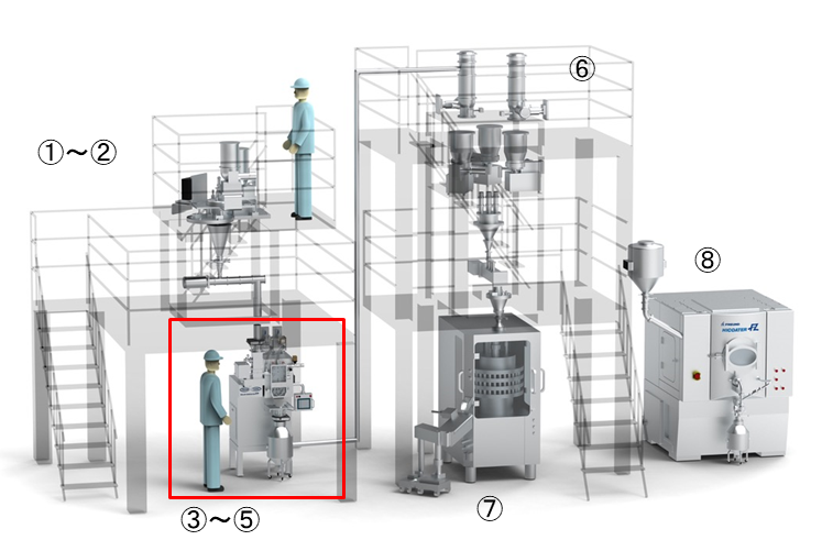 本システムは、①原料投入→②原料混合→③圧縮成形→④整粒→⑤PATツールによる物性測定→⑥滑沢剤・後末混合→⑦打錠→⑧錠剤コーティングの各工程で構成されています。
