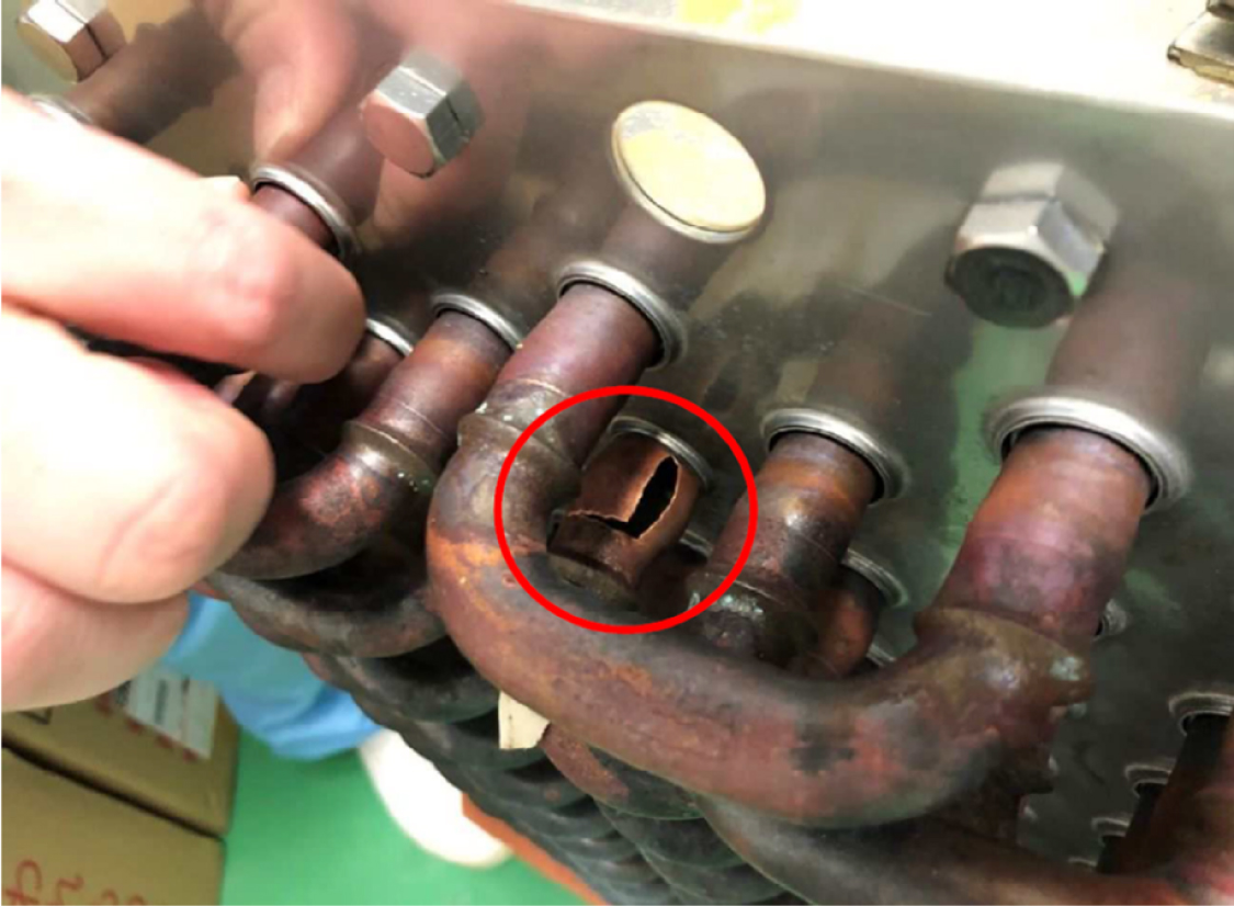 「冷却コイルのチューブ内に残った水が、外気の低下によって凍結し、膨張してコイルを破裂させる」