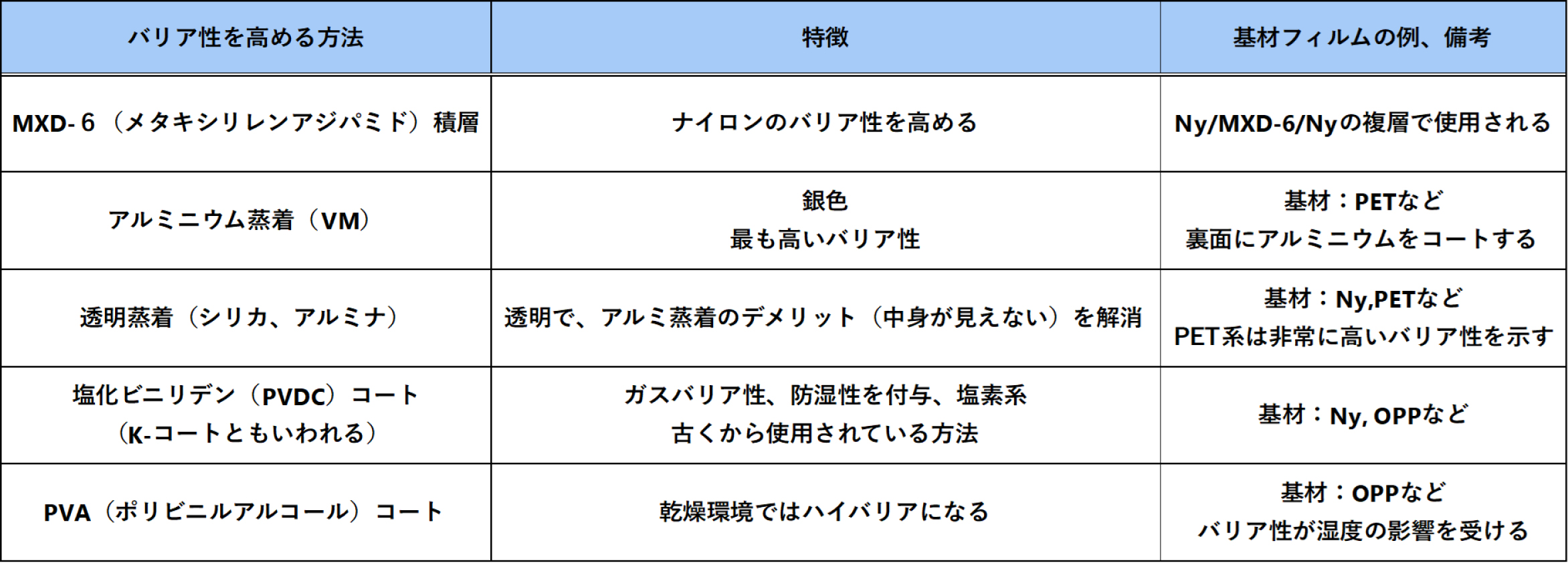 「OPP」や「PET」、「Ny(PA)」には一定の防湿性やガスバリア性がありますが、表面処理により、バリア性を高めてハイバリアにする技術があり、広く使用されています。品質保持剤(特に脱酸素剤)を使用した包装用には、ハイバリアフィルムが求められます。