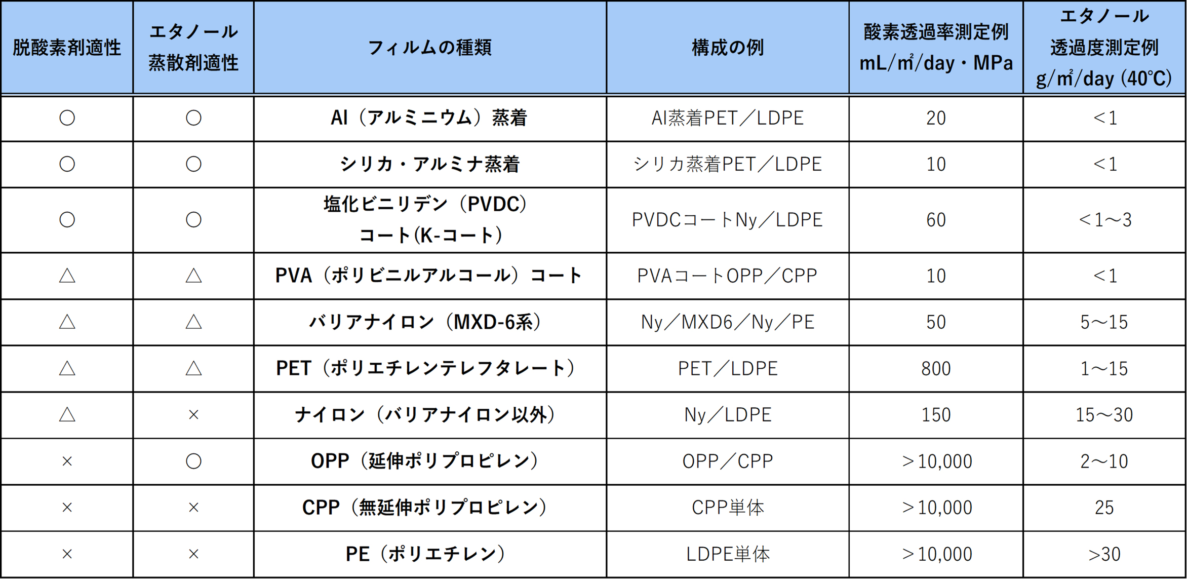 脱酸素剤には「酸素バリア性(低い酸素透過度)」、エタノール蒸散剤には「エタノールバリア性(低いエタノール透過度)」が求められます。 - 具体的な数値基準で判断する