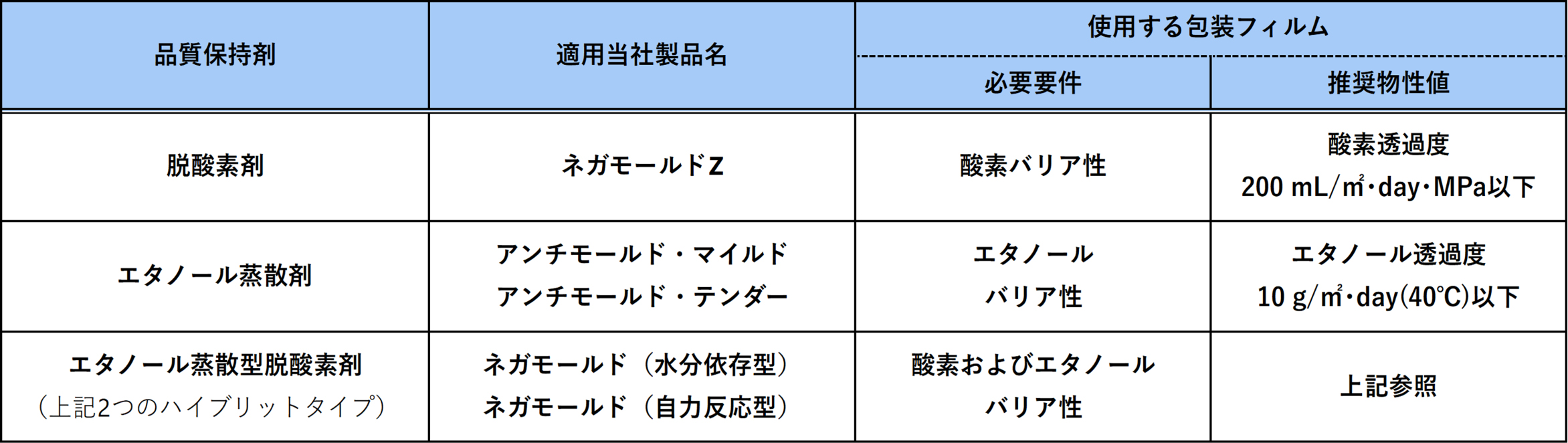 では、具体的にどの程度のバリア性(透過度)が必要なのでしょうか。当社では、品質保持剤のタイプに応じて、以下のような物性値を推奨しています。