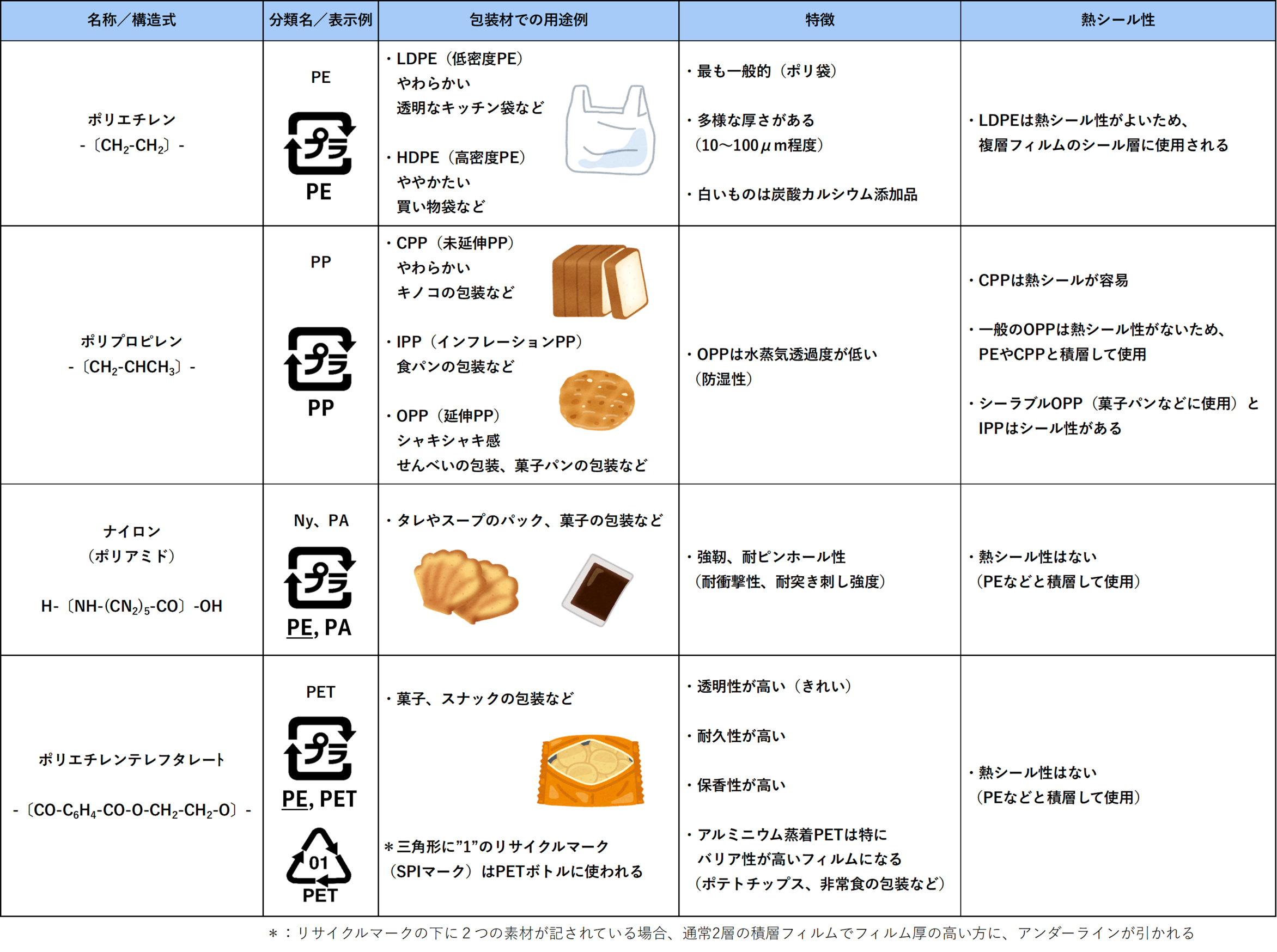 以下に、食品包装に使用される主な樹脂フィルムの特徴をまとめました。
