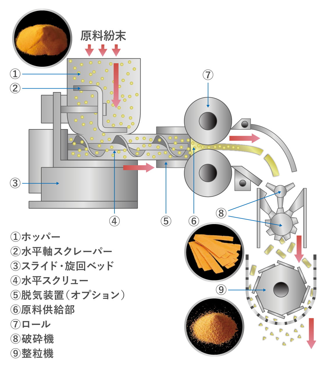 - シンプルなプロセス:湿式造粒に必要な「練合」「乾燥」といった複雑な工程が不要で、プロセスがシンプルかつ連続的です。