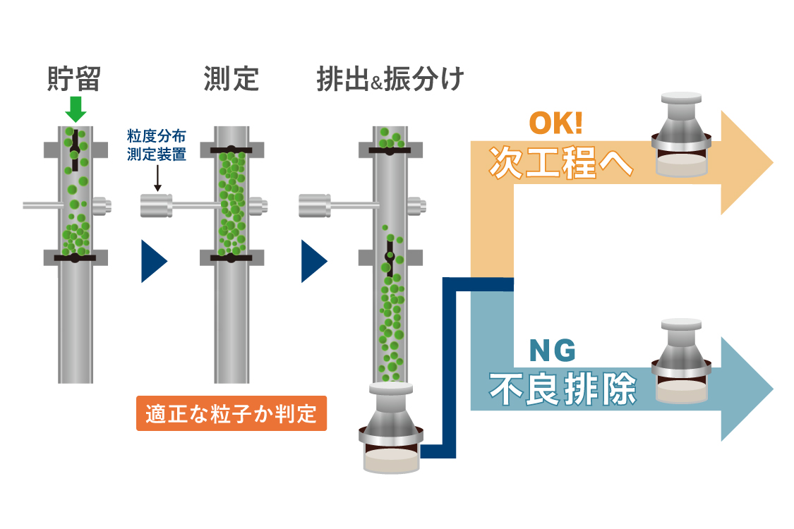 工程間の粉体搬送は、品質を左右する重要なポイントです。従来の空気輸送では、輸送中に粒子の偏析(大小の粒子が分離してしまう現象)や微粉化(粒子が壊れてしまう現象)が起こるリスクがありました。